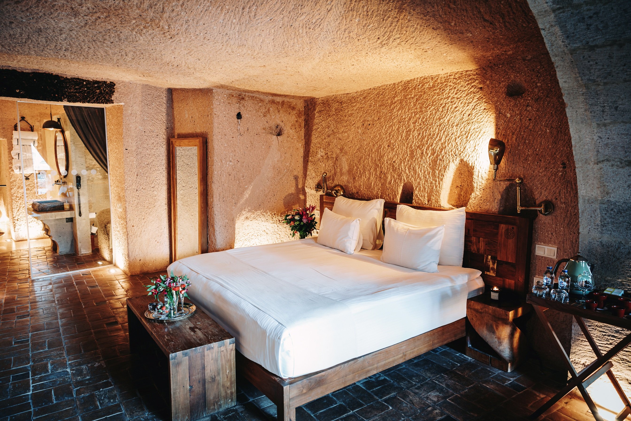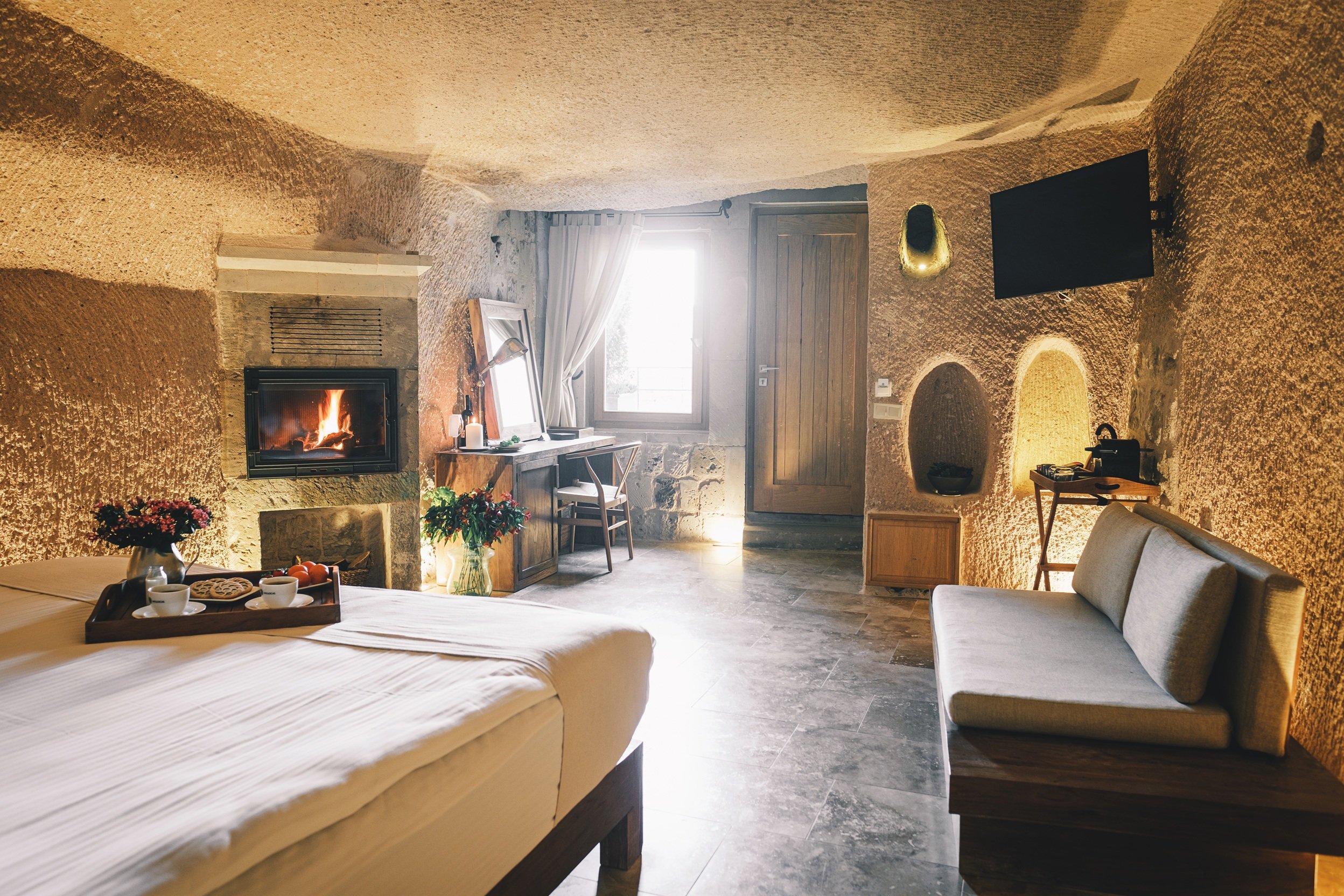 Suites (40 sqm) offer fireplaces, bathtub or jacuzzi and cave experience.